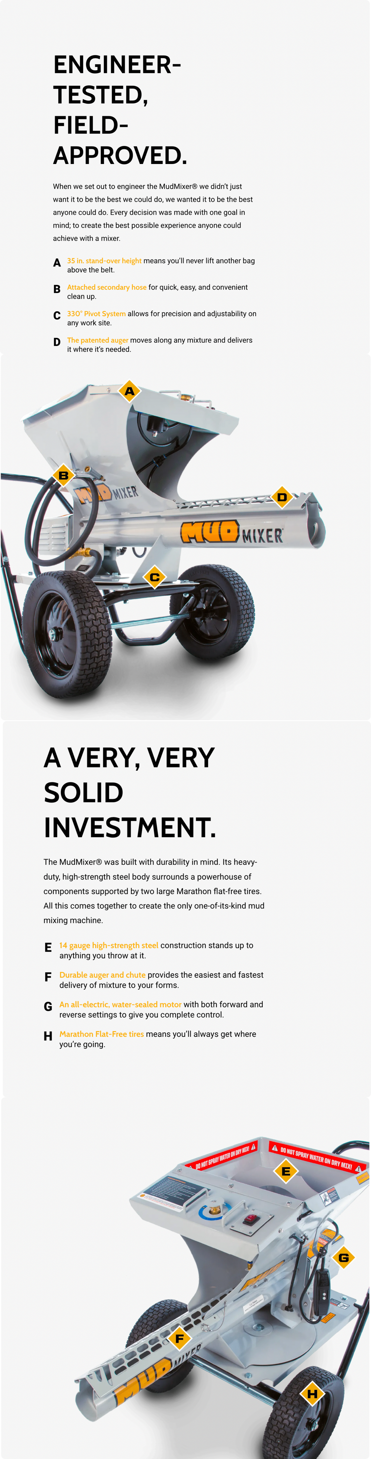 Because MudMixer® products are built for durability and longevity, they can be used by professional contractors. The mixer has been engineer tested and feild approved. One person can mix 1 yard of concrete in an hour, speeding up those smaller pours. Being the fastest, easiest multi-use mixer on the market, DIY enthusiasts as well as professionals will have no problem operating the mixer.